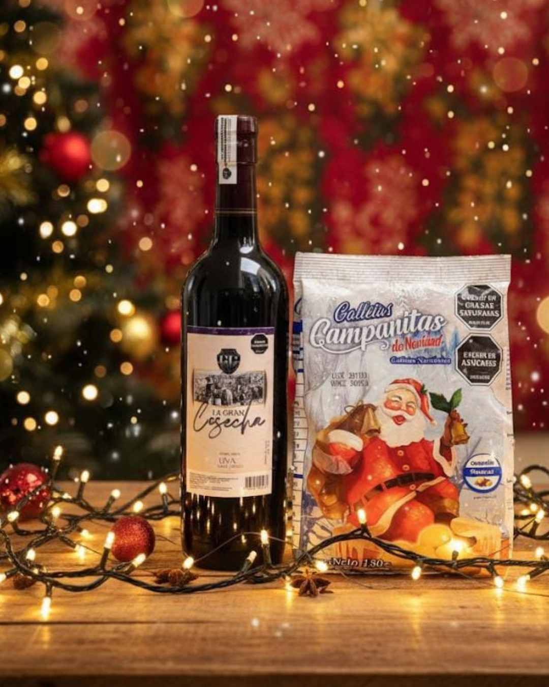 MATRIMONIO BOTELLA DE VINO 0 GRADOS GALLETA CAMPANITA 180 GRAMOS BOLSA NAVIDEÑA Y MOÑO